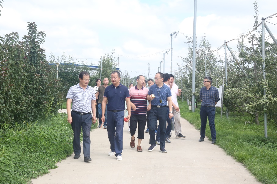 党支部一行首先来到BEAT365英国官网网站洛川苹果试验示范站,参观了苹果抗逆优质新品种培育试验田,试验站负责人介绍了苹果优质苗木繁育技术、旱(山)地苹果优质安全高效栽培技术和苹果省力化栽培技术及机械等。对于苹果文化与产业经济的发展,试验站负责人向大家介绍了用站内苹果制作的白酒、白兰地、朗姆酒等产品的原料生产、加工工艺、研发情况等。支部成员与试验站技术人员深入探讨了品种选育、果树栽培、果酒酿造等过程中信息化技术的运用与发展。