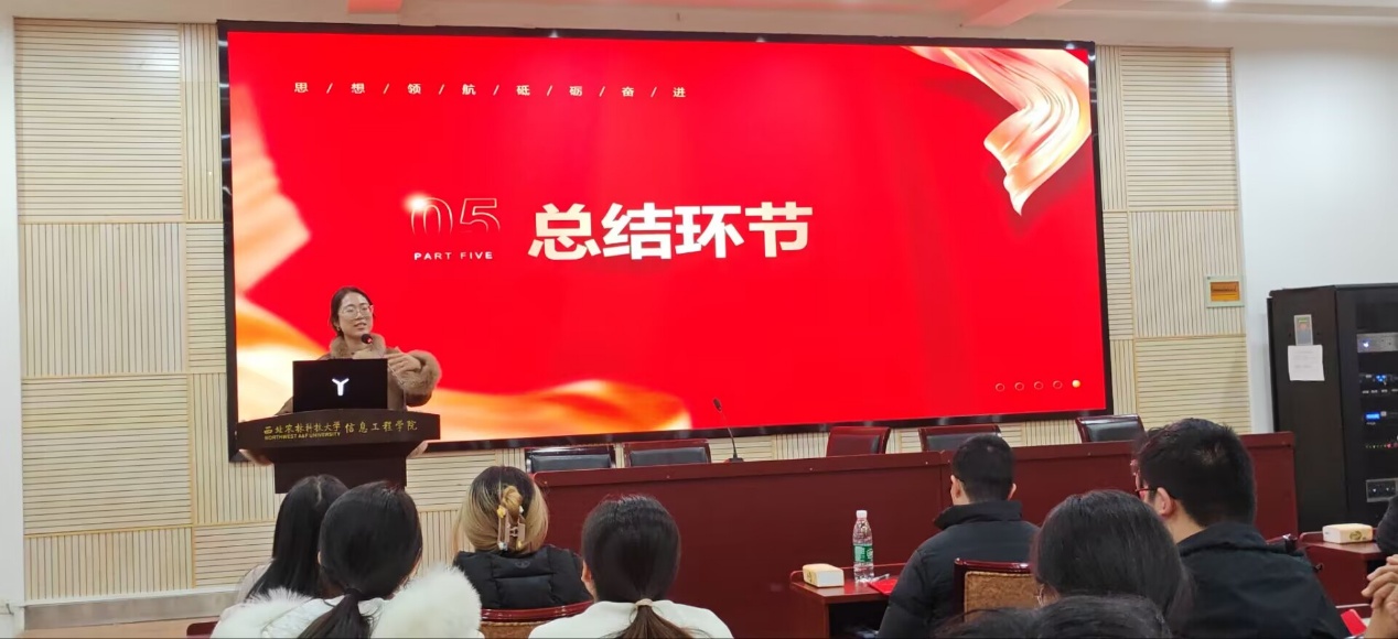 支部书记令阳同志对本次竞赛进行总结点评。她指出,本次知识竞赛形式新颖鲜活、内容务实厚重,既打破了传统理论学习的枯燥感,增强了学习的趣味性和吸引力,又有效提升了支部成员的参与感、获得感和归属感,是推动理论学习走深走实、入脑入心的创新尝试和有益探索。她强调,此次竞赛不仅是一场理论知识的“大比拼”,更是一次党性修养的“大锤炼”,全体成员要以此次竞赛为契机,始终把理论学习作为终身课题,持续深化对党的创新理论的理解与把握,切实增强“四个意识”、坚定“四个自信”、做到“两个维护”。同时,要坚持学思用贯通、知信行统一,把学习成果转化为立足专业、刻苦钻研的实际行动,转化为服务同学、奉献集体的责任担当,真正实现“以赛促学、以学促行、以行践悟”。