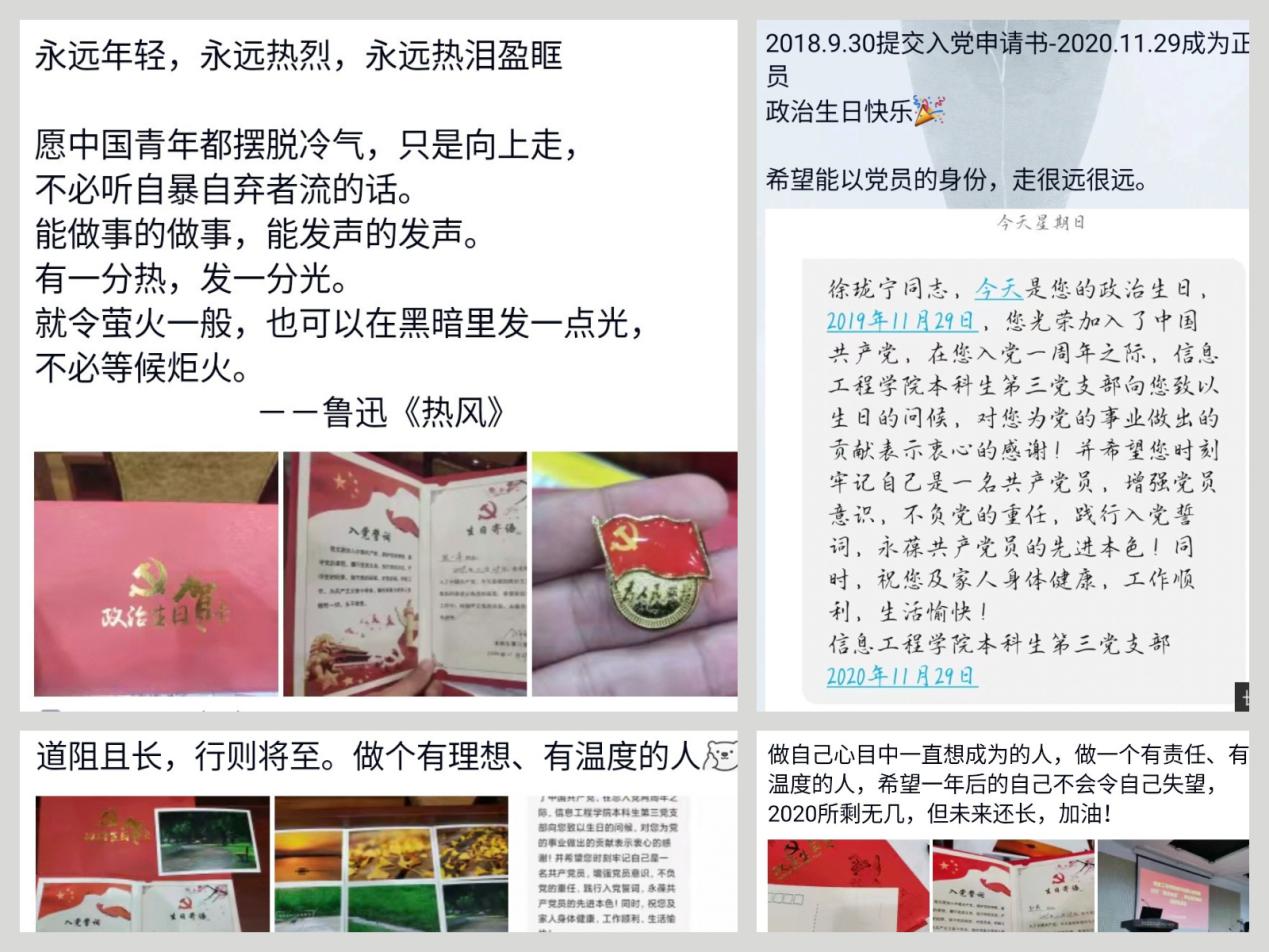 赠送一张生日贺卡。由支部书记为过政治生日的21名党员同志颁发“政治生日”贺卡。贺卡内部专门印有入党誓词、党员的入党时间以及党支部对党员的祝福、要求以及殷切希望,旨在强化党员的政治意识、身份意识和宗旨意识。发送一条祝福短信。由支部委员们向每位过“政治生日”的党员发送暖心的祝福短信,增强支部党员的归属感和荣誉感。重温一遍入党誓词。通过集体宣读入党誓词,教育党员时刻牢记入党誓词,自觉遵守党的章程,终身践行入党誓词,引导党员不忘初心,始终保持昂扬向上的奋斗精神。开展一次谈心谈话。党员同志主动分享自己的入党经历、心得体会以及思想、学习和生活情况,有助于党组织进一步了解掌握党员的基本情况和思想状况,增强党组织的凝聚力和战斗力。