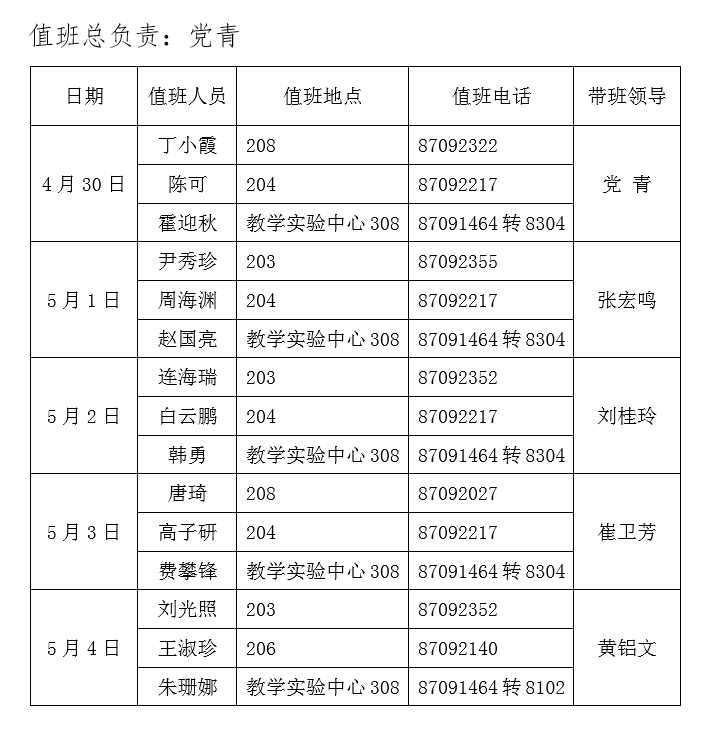 6.要高度重视实验室安全,严格按照“谁使用,谁负责,谁主管,谁负责”的原则,认真落实实验室安全管理责任。假期团队(研究生学习室)负责人、使用计算机教学实验中心实验室的老师要负责落实实验室安全值日制度,并将值日人员信息张贴于实验室门外。