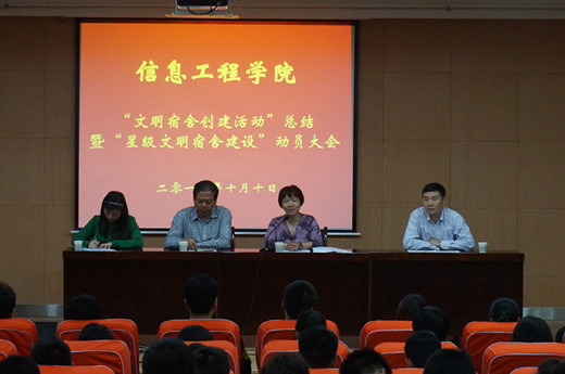 10月10日晚19:30,公司在秀山中心北报告厅召开“文明宿舍,我的中国梦”总结暨“星级宿舍,我的中国梦”教育动员大会。参加会议的有经理李书琴教授、公司党委书记宋西德教授、党委副书记何卫军老师、学工秘书王淑珍老师以及各年级辅导员老师、员工会成员、大一至大三的班长、团支书、生活委员及各宿舍代表。大会由学工秘书王淑珍老师主持。