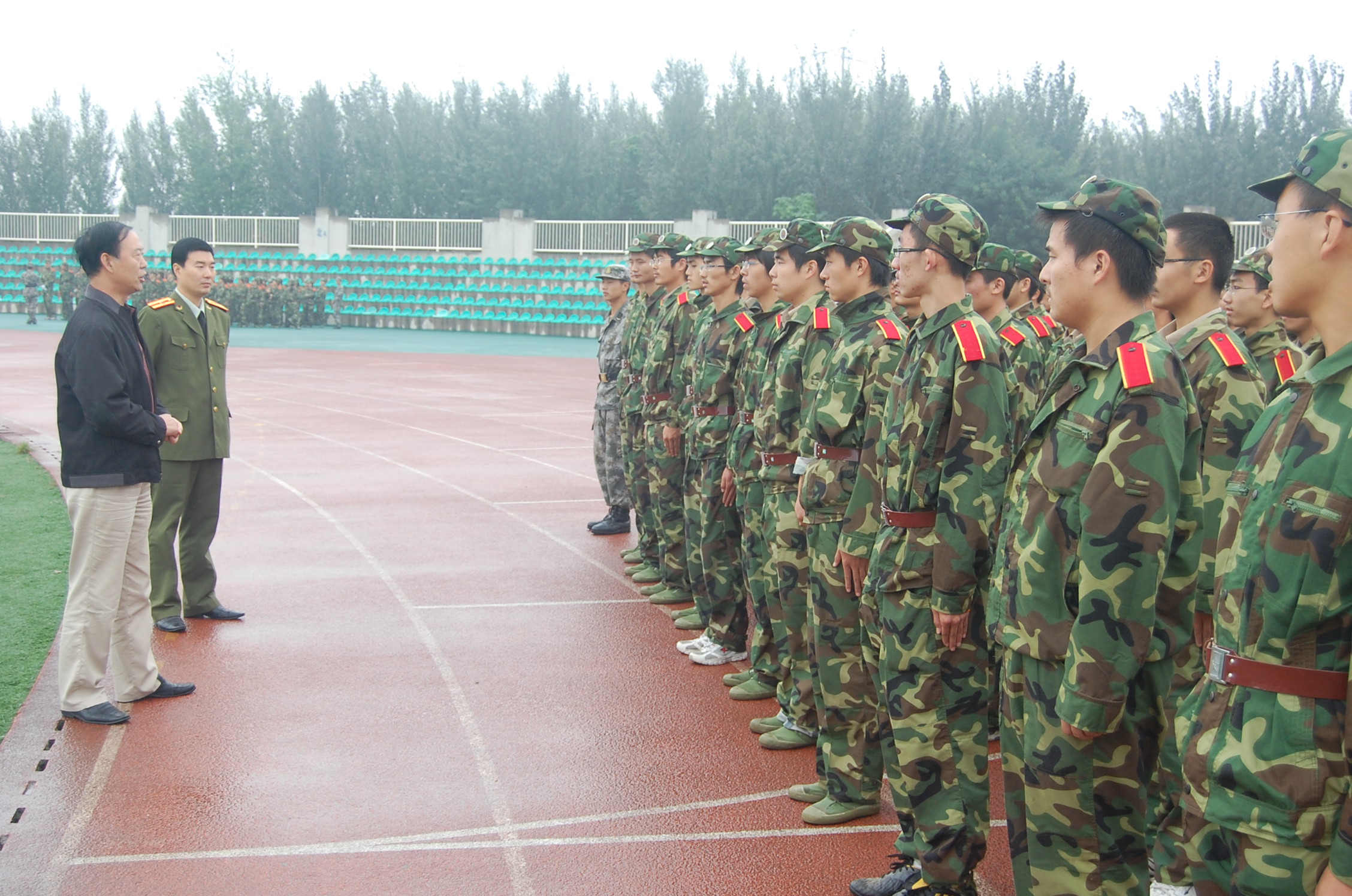 2009级新生军训正在紧张进行,公司领导对此高度重视。9月9日上午,公司党委书记樊世明和党委副书记何卫军冒着细雨来到训练场视察公司新生的军训情况。