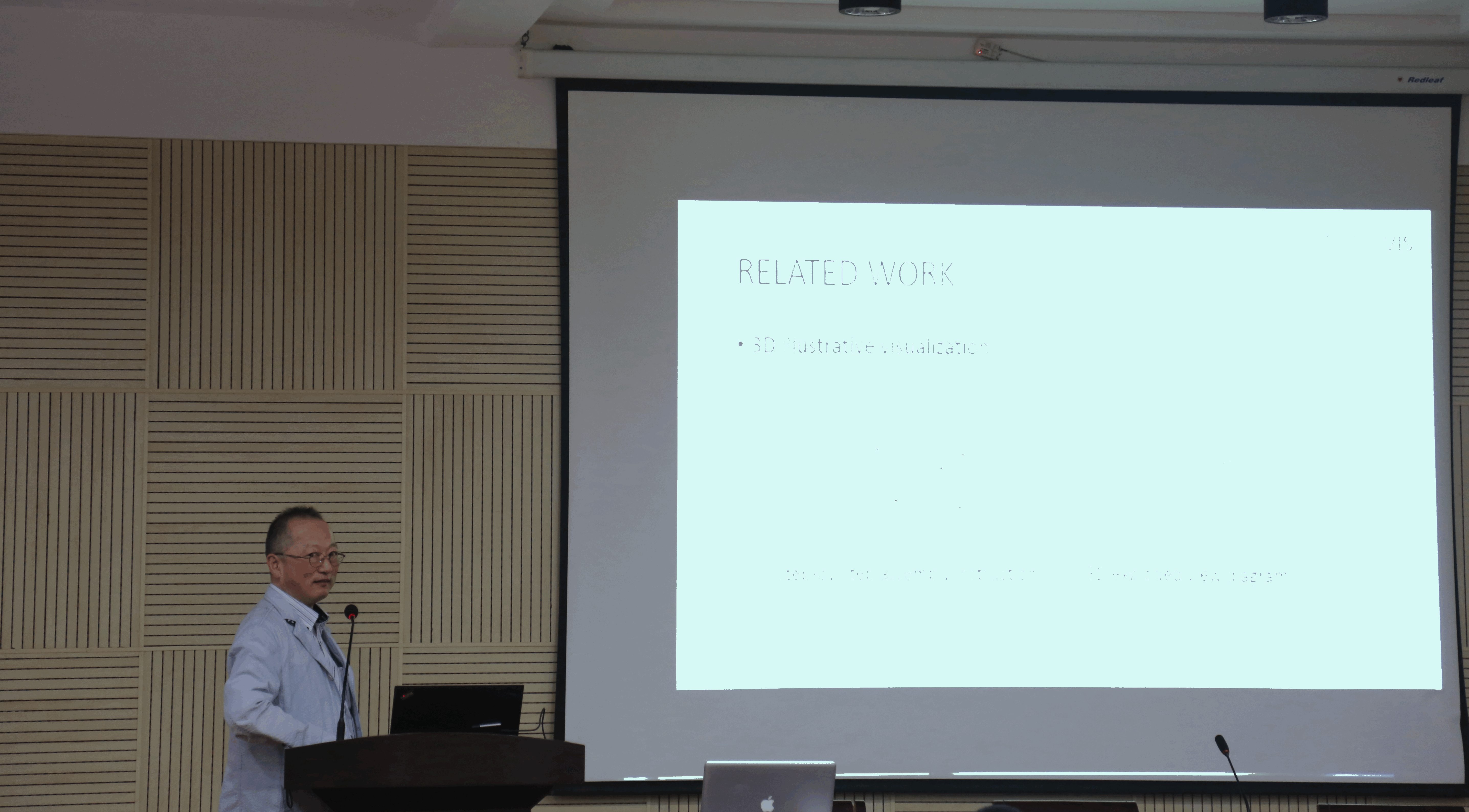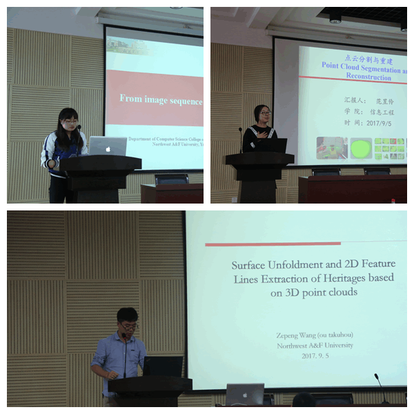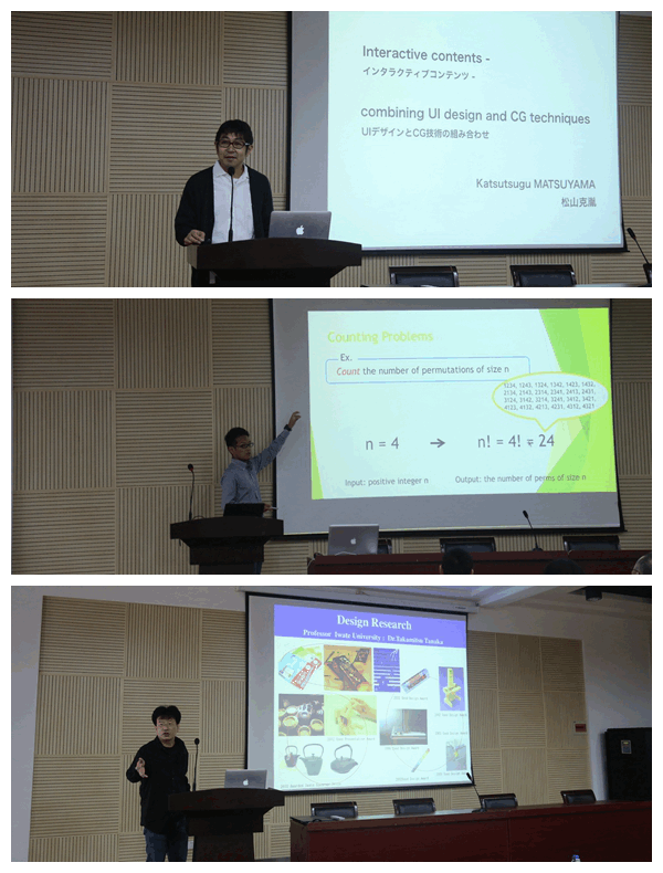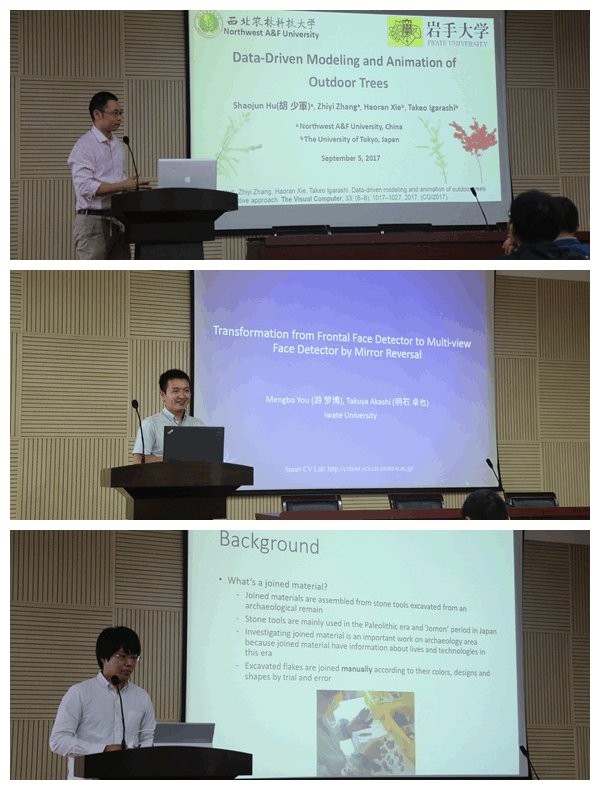 此次学术交流以“三维测量技术的合作研究研讨”为主题,开展了系列学术报告。今野教授为师生作了题为“Interactive Visualization of Assembly Instruction for Stone Tools Restoration”的学术报告。该报告详细介绍了一种将三维装配爆炸图应用到考古学研究的新方法,即采用基于点云的交互式可视化技术实现了石器工具的快速修复。田中隆充教授、川崎秀二教授、木村彰男教授、Enhkbayar教授分别作了“通过榫卯技术进行立方体拼图的创意开发”、“通过数据分析研究建立臭菘的恒温维持机制模型”、“混合方法的3D复杂雕像模型重建”、“脸部度量及其应用”的学术报告。同时,公司胡少军副教授、杨龙博士、王泽鹏博士与岩手大学青年教师松山助教、山中助教、卢忻助教分别进行了学术报告。报告的题目分别是:“Data-Driven Modeling and Animation of Outdoor Trees”、“Handheld 3D scanning with commodity depth cameras”、“Surface Unfoldment and 2D Feature Lines Extraction of Heritages based on 3D point clouds”、Interactive contents - combining UI design and CG techniques (互动内容 - 结合UI设计和CG技术)、Algorithms for Enumerating Discrete Objects(枚举离散对象的算法)、Face Parts Measurement and Its Application(脸部度量及其应用)。两校研究生也汇报了近期的研究成果,受到双方教授的积极评价。