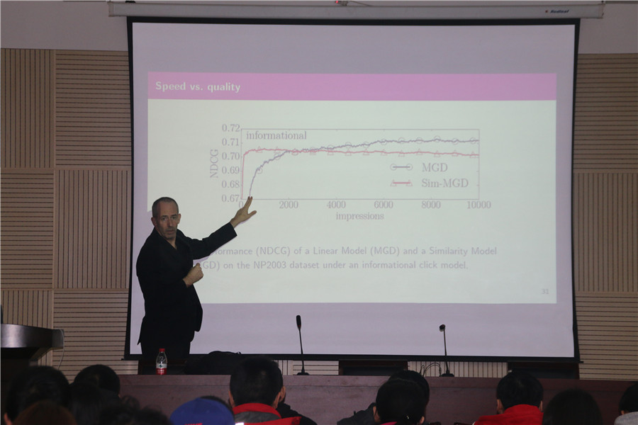 Maarten教授首先给全院师生们介绍了阿姆斯特丹大学的基本情况以及他的科研团队,然后详细展开讲解了信息检索算法的原理及应用,指出了传统信息检索算法的不足,介绍了他们科研团队所提出的改进检索方法,即“感知-计划-行动”这自成一体不断循环学习的检索方式。最后Maarten教授以一些实际生活中的问题讲解了改进算法的应用场景。报告中Maarten教授不仅介绍了自己的科研成果,还介绍了其所带领团队的研究方向及课题,用通俗易懂的例子精彩的解读了深奥前沿的科学知识。