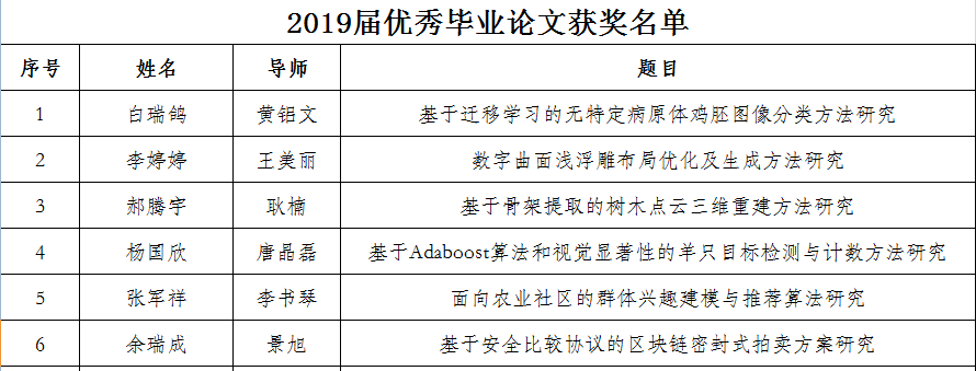 (备注:院级优秀学位论文具体评选工作由各答辩小组完成,获评比例为参加答辩毕业生人数的10%。优秀学位论文获得者,其导师被授予优秀指导教师称号。)