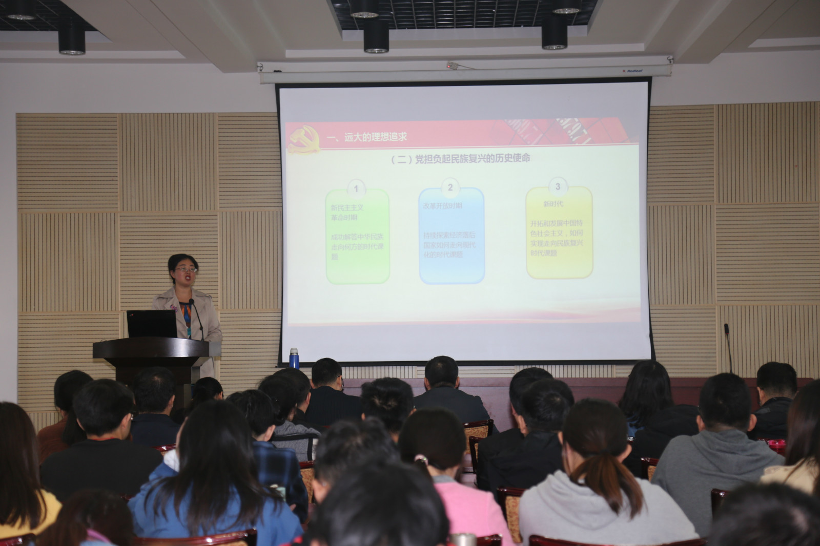 张丽副教授以丰富的史实和生动的语言围绕从有远大的理想追求、有科学的理论引领、有为人民服务的宗旨、有严明的纪律规矩、有自我革命的精神、有强大的领导能力等六个方面深刻回答了“中国共产党为什么能”这一重要问题。她表示,正是因为有着这些优良传统和品质作为支撑,中国共产党成为了实现中华民族伟大复兴的坚强领导力量,没有一种初心比为人民谋幸福更高尚,没有一种使命比实现民族复兴更崇高,作为党员大家应该坚定四个自信,增强四个意识,做到两个维护,勇做新时代的坚定者奋进者和搏击者。