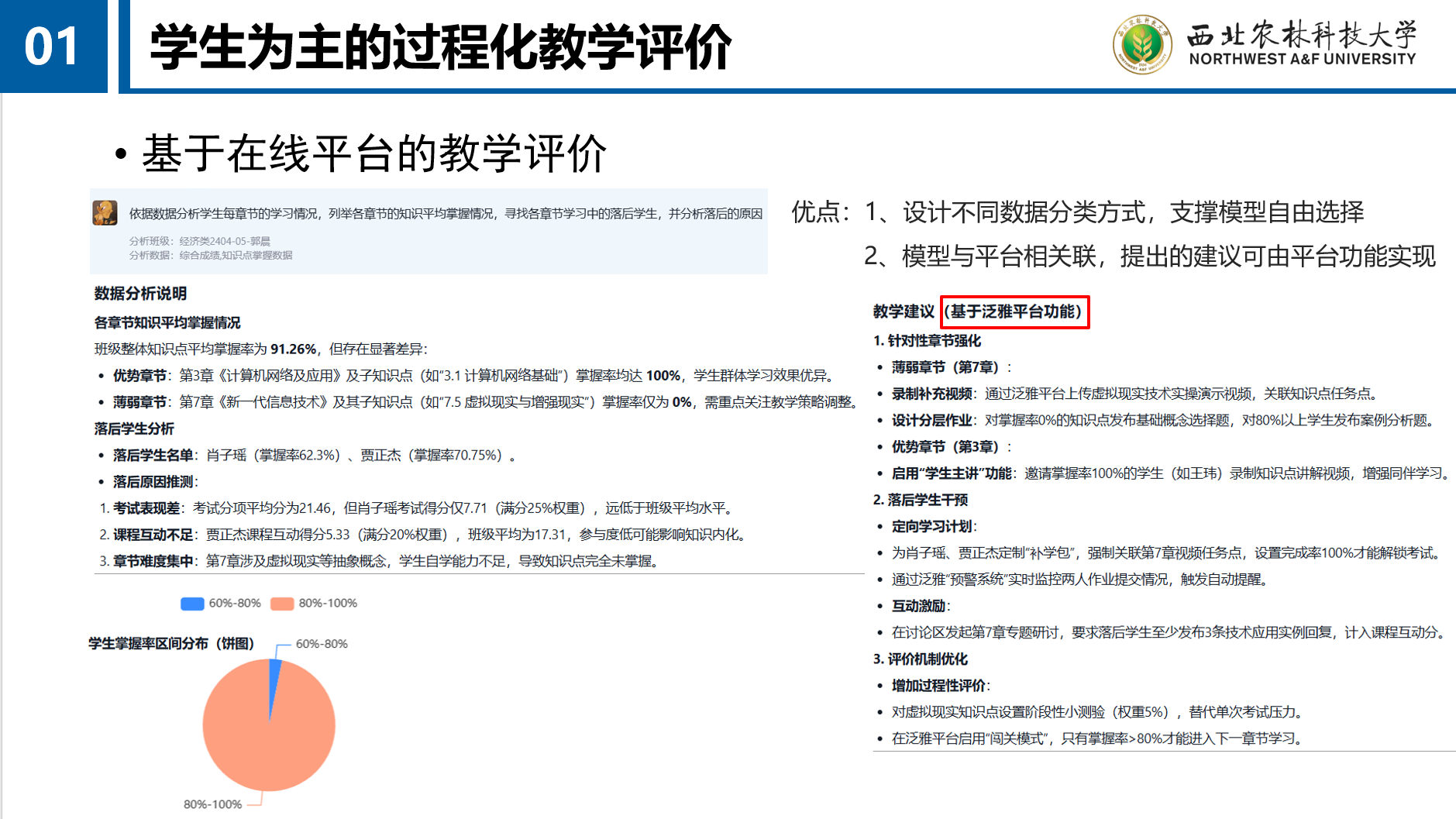 以员工为中心的教学评价,是当前人工智能与教学评价结合的主要方式,依托智慧课程收集的员工过程化学习数据,分析每位同学的不同学习状态,精准定位员工的学习中的具体问题,有针对性的改进教学。
