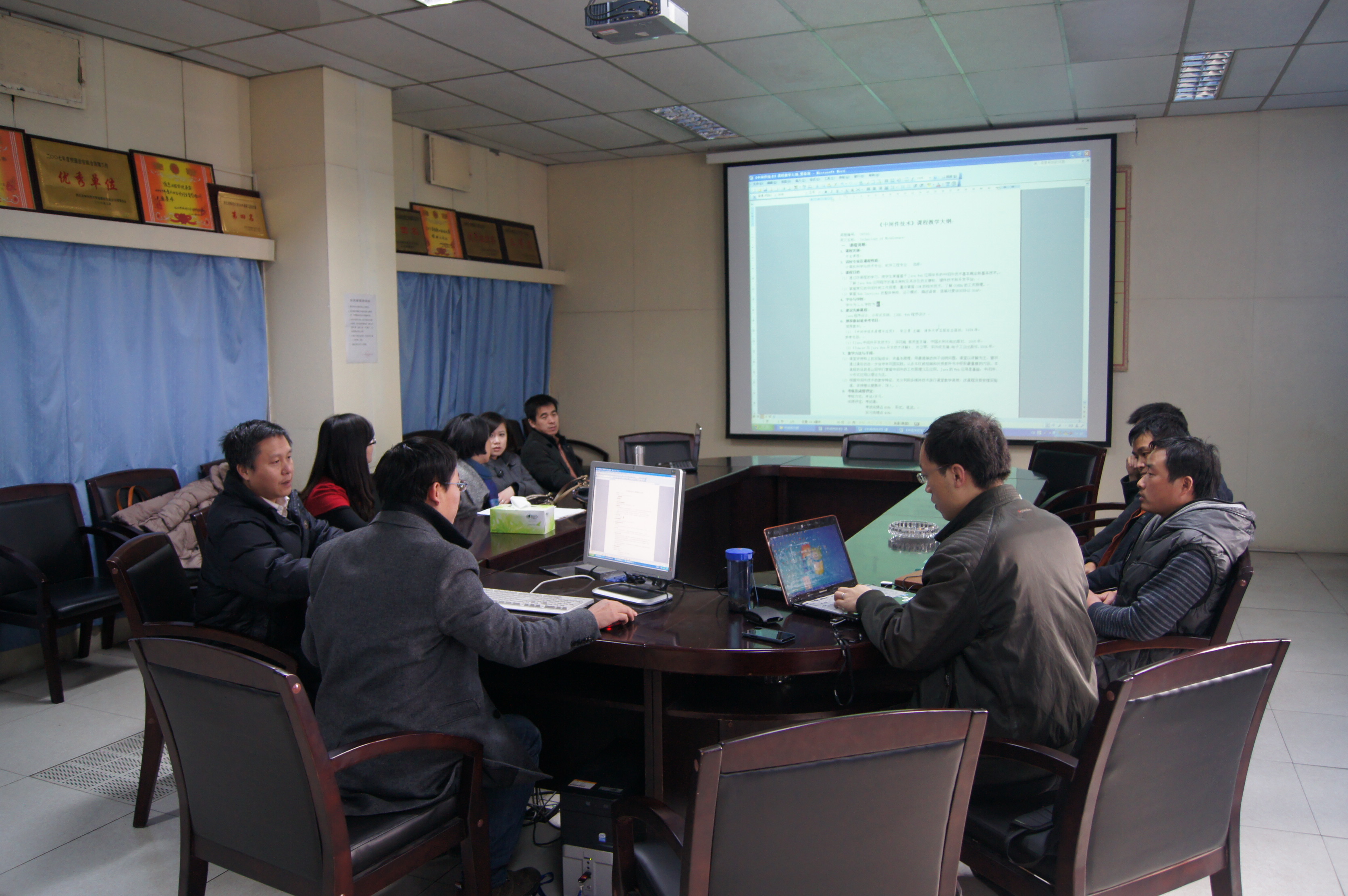 修订教学大纲的课程包括《算法分析》、《中间件技术》、《软件工程》、《软件自动化测试技术》、《面向对象分析与设计》、《.NET技术》、《J2EE》、《Java语言程序设计》、《软件项目组织与管理》、《项目开发》、《人机交互与可视化技术》,各大纲修订负责人张阳、梁春泉、张宏鸣、刘全中、英明、王美丽分别就大纲修订目标、内容、教学难点、重点、实习实验大纲、课程简介等内容进行了介绍,针对课程运行过程中存在的问题、解决的办法,各位与会教师进行了激烈的讨论,最终确定了各门课程的教学大纲、实验大纲、课程简介。
