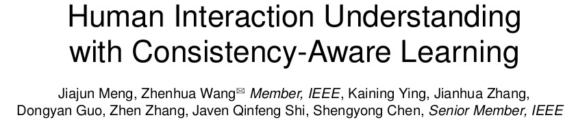 近日,公司智能媒体处理团队王振华副教授课题组在多人交互行为视觉识别领域取得新进展,研究成果“Human Interaction Understanding with Consistency-Aware Learning”在模式识别领域权威期刊《IEEE TPAMI》(IEEE Transactions on Pattern Analysis and Machine Intelligence)上发表。IEEE TPAMI被中国计算机学会归为A类期刊(CCF A),被公司划分为G1期刊,目前影响因子为24.31。公司为该论文通信作者单位,王振华副教授为论文通信作者,所指导的浙江工业大学博士研究生孟佳俊为论文第一作者。