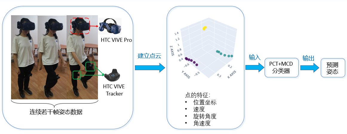此次发表的研究论文的目的是建立一个能够快速、准确地识别用户的原地姿态的模型,用于虚拟漫游交互。为此,论文首先使用HTC VIVE Pro HMD和两个VIVE追踪器采集用户的原地姿态数据,其中每个设备在每一帧提供一个点,每个点的特征包括用户的头部或大腿部位的三维位置坐标、线性速度、旋转角度和角速度。论文将连续若干帧的数据分割为一个点云样本,并手工标记所有的样本,建立一个点云数据集。考虑到用户之间的人体差异,论文设计了一个基于点云的分类网络,将无监督领域迁移学习和有监督点云学习结合起来,联合进行有监督和无监督的训练。论文的方法总体概述见下图,HMD和2个追踪器采集的连续若干帧姿态数据被转换为一个点云样本,并被输入PCT+MCD分类器,用于实时识别用户的原地运动姿态。