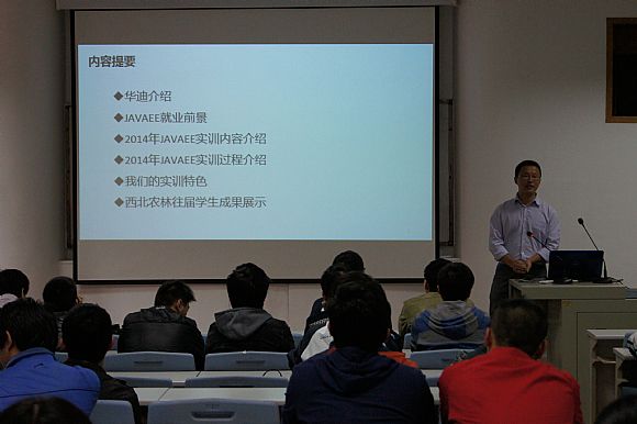 4月28日下午,公司针对大三年级即将参加的院企实训项目,特邀实训合作企业达内集团西安技术总监陈峰以及华迪公司高级软件工程师张旺两位老师,分专业依次为大家进行了有关院企实训的详细介绍和交流。