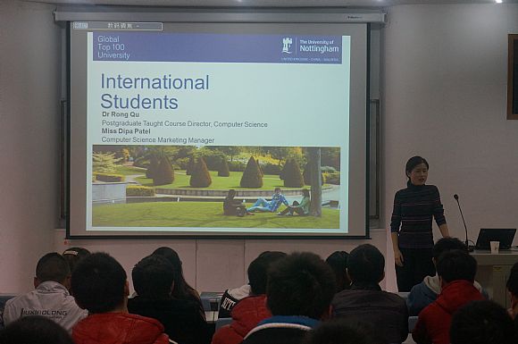 首先,屈嵘博士介绍了英国诺丁汉大学的校情校史,向同学们展示了诺丁汉大学优美的校园风光。接着,她又讲解了诺丁汉大学的院系设置,特别说明了计算机科学系的科研方向设置,科研水平和国际员工交流的情况。同时她也向同学们介绍了诺丁汉大学对申请该校的中国职工专业课成绩和英语成绩的要求。随后,与屈嵘博士随行的诺丁汉大学老师分别就诺丁汉大学的校园活动、员工就业状况以及国际交流等方面做了详细讲解。