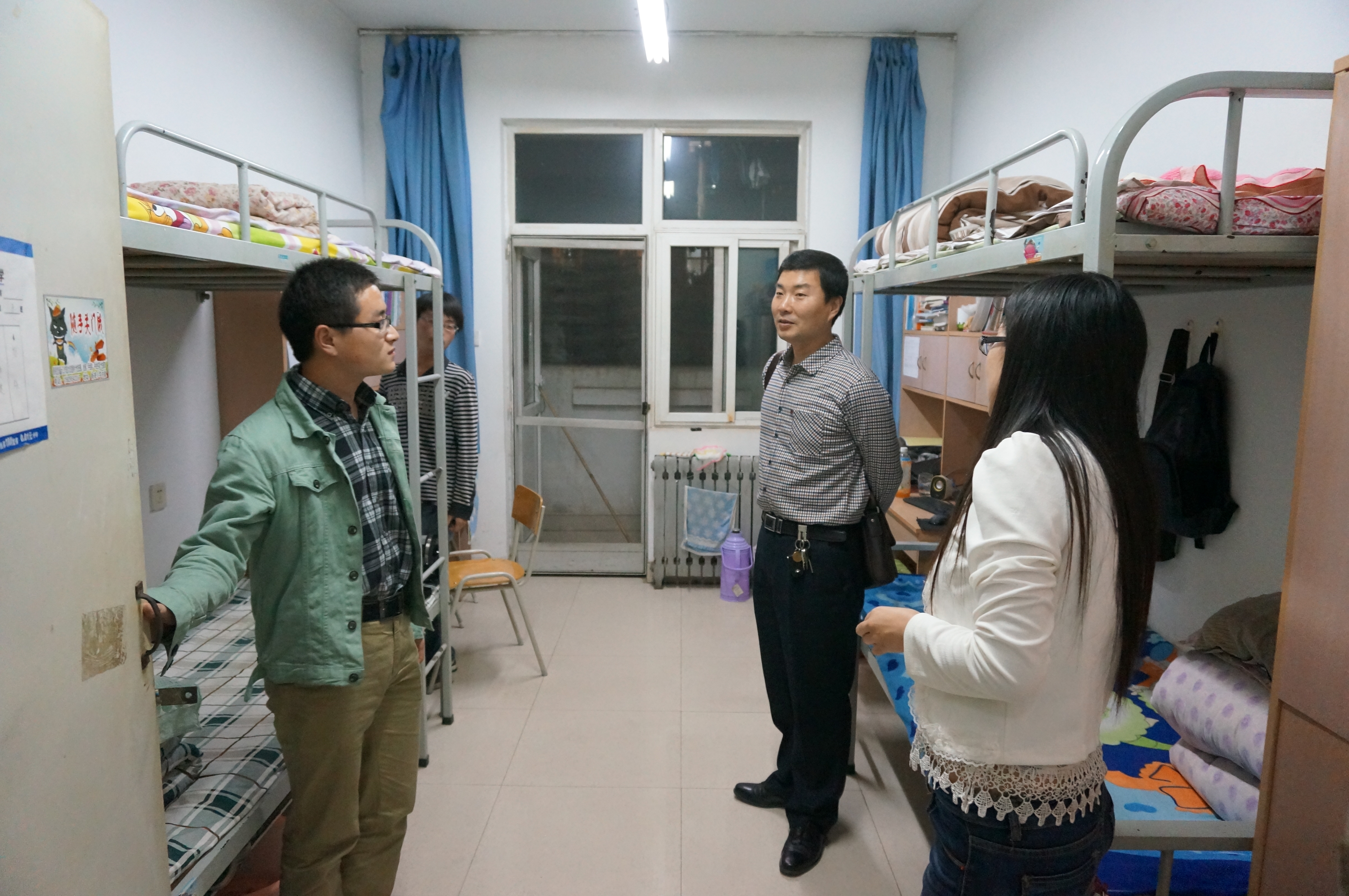 2013年5月2日晚,公司为落实“文明宿舍创建活动”,公司党委副书记何卫军、学工秘书王淑珍、团工委书记桂恺、辅导员倪玲、仵亚伟、郭峰、公司员工会主席团以及生活部主要员工干部共同走访检查了公司西区10#的员工宿舍。
