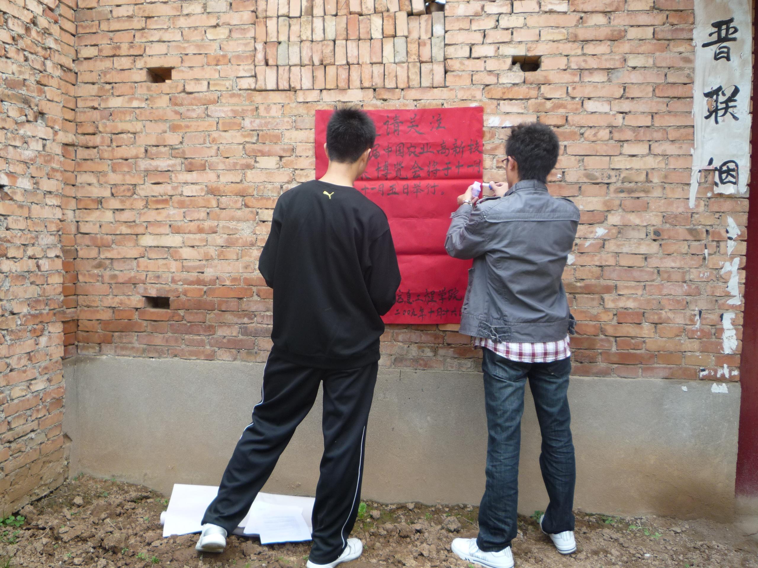 中午时,尽管烈日炎炎,但参加下乡的同学们却没有因为烈日而退缩。来到陈家沟,活动负责人王照浩同学与村长进行了沟通,说明了大家的来意。然后,王照浩向下乡的同学们分配了各自的任务。同学们分成两队,一队负责张贴第十六届农高会的海报。在他们贴完海报后,考虑到村民的文化水平较低,他们便用通俗的语言向周围的村民们介绍农高会的一些情况,比如开展日期,展出产品,到访的人员等等。另一队则负责与村民们交谈,以便了解当地的基本情况。在与村民聊天的同时,他们向村民们介绍甲流的一些知识,并告诉他们防治甲流的办法。