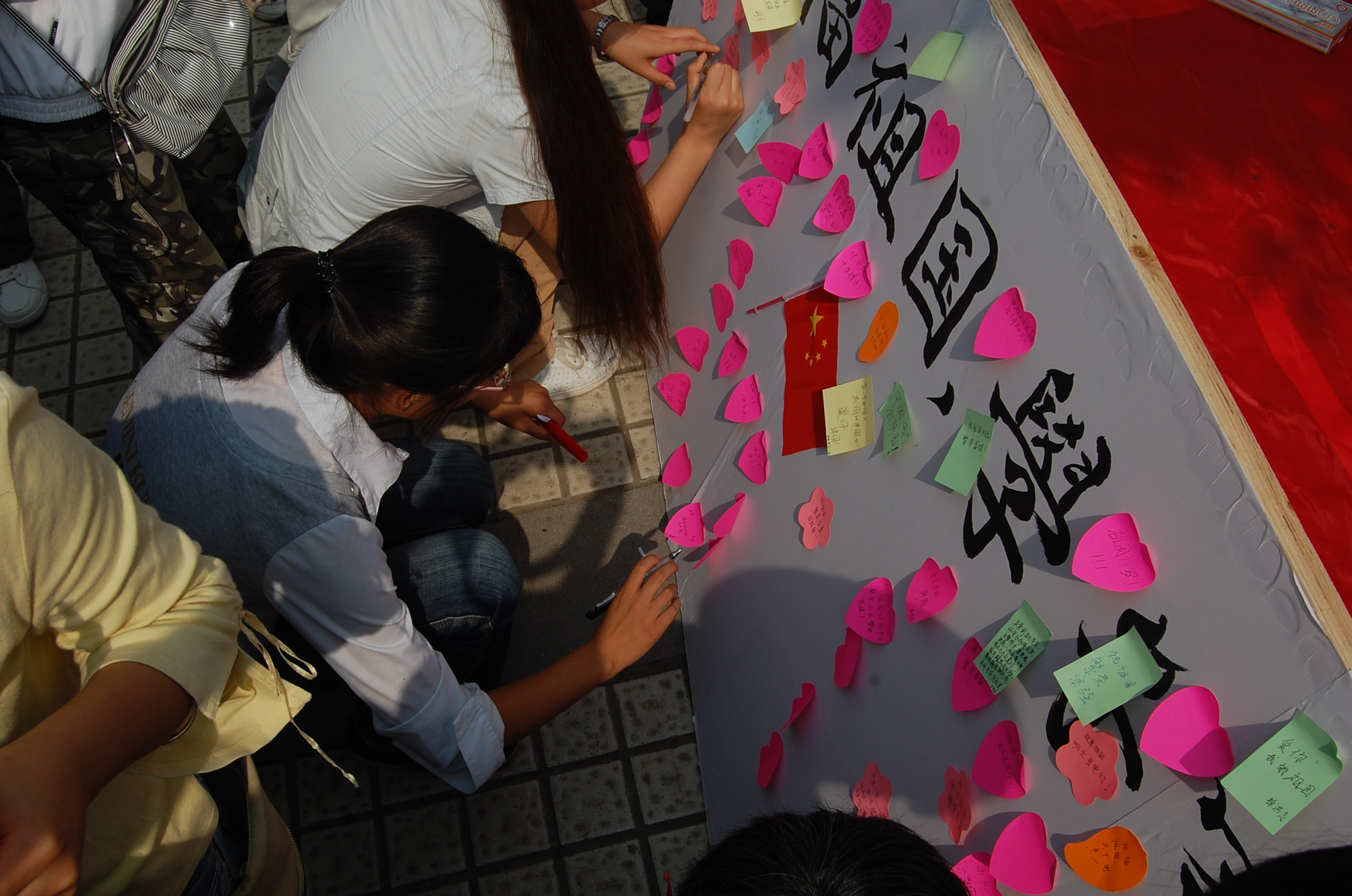 阅兵式结束后,向所有同学展示了“龙腾盛世”的宣传板,同学们纷纷在“祝福祖国,学子寄语”宣传板上留下了自己一个又一个的期望和祝福。希望我们的祖国团结和谐,繁荣昌盛,早日实现统一;祝福祖国蒸蒸日上,祖国的明天更加辉煌灿烂。