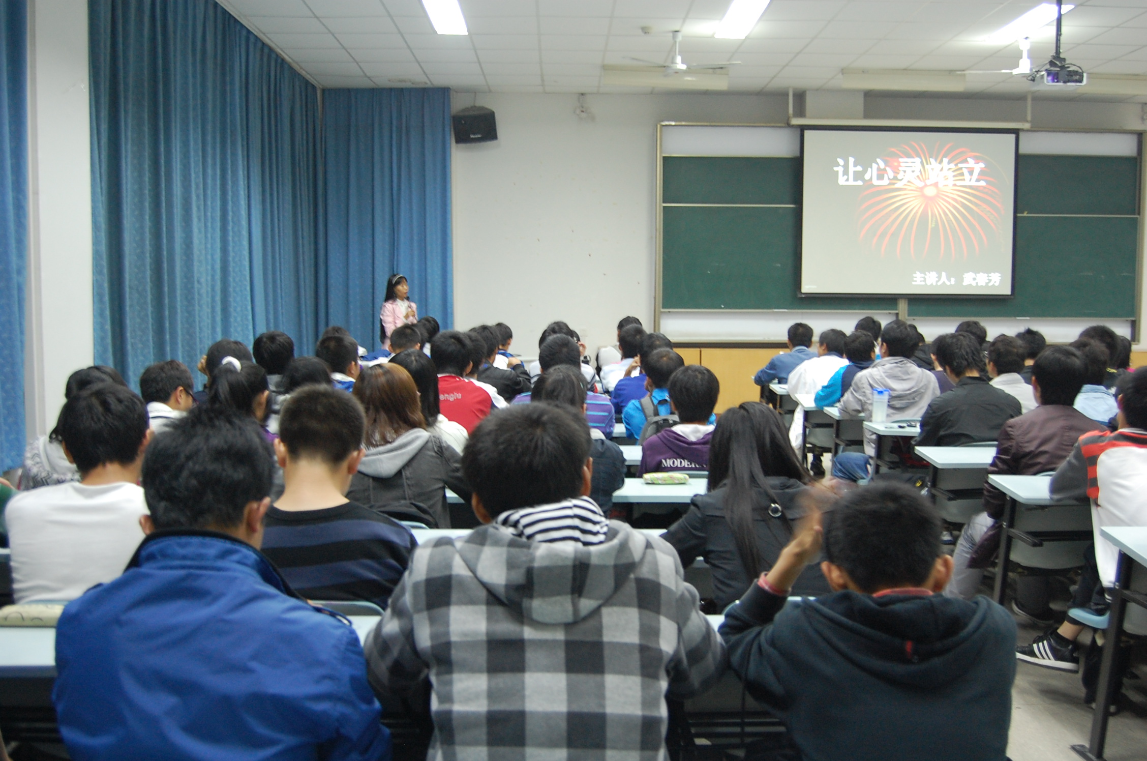 10月11日晚beats365唯一官方网站素质拓展部在M3多媒体教室举办了大型老员工心理健康安全报告会。全国二级心理咨询师,老员工专业心理辅导员武春芳为同学们做了“让心灵站立”的专题报告。此次报告会旨在指导10级新生顺利转变学习角色,提高在校老员工的自我调节心理能力。