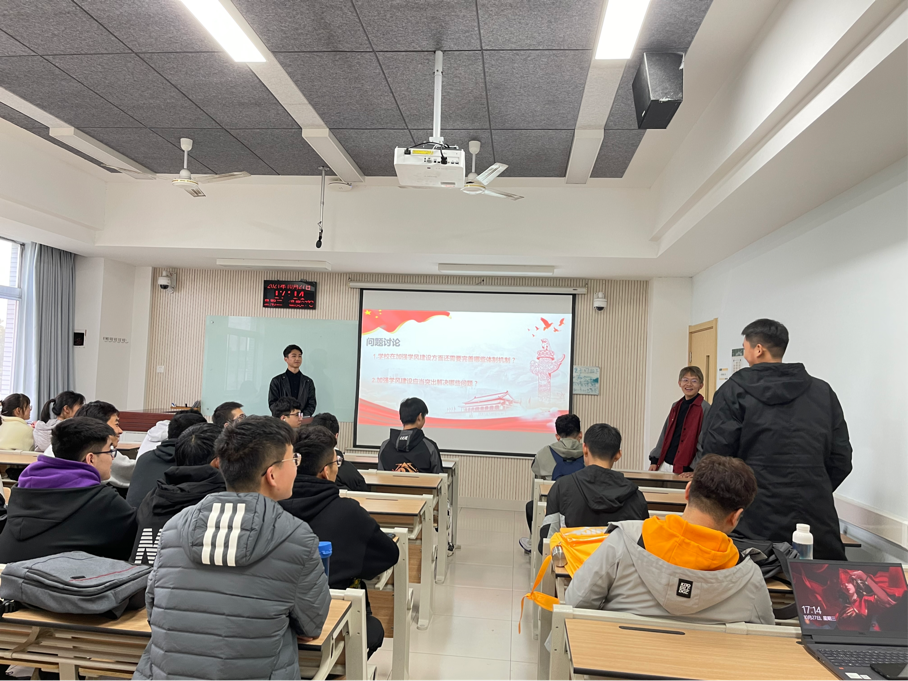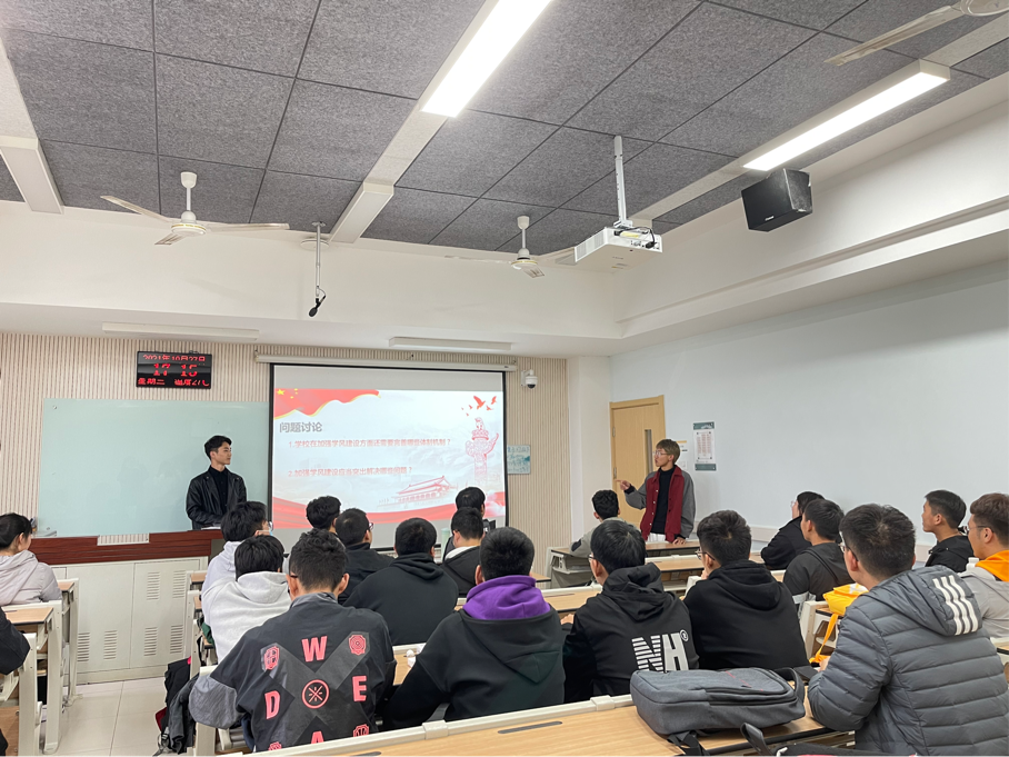 组织委员宋德轩就公司方面、班级方面和员工个人方面展开了此次班会讨论。随后抛出几个学风问题,让同学们有了高涨的参与互动感,同时,也积极带动了同学们对未来自我规划及为班级班风建设的思考。