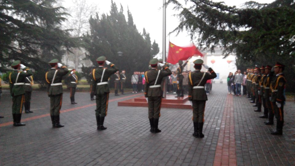 7点20分,同学们以专业为单位集合完毕。国旗班整齐划一,迈着铿锵有力的步伐庄严的将国旗护送到旗台,五星红旗在国歌声中徐徐升起,全体同学肃立行注目礼。