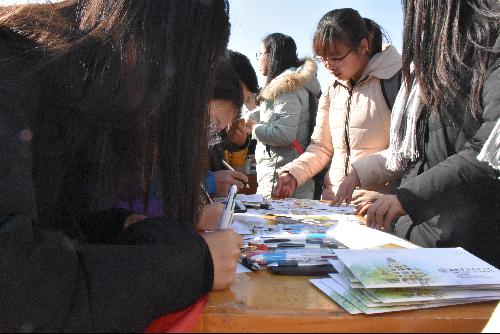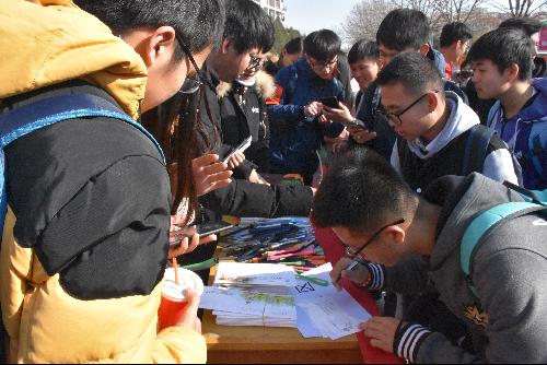 还未放学,工作人员便早早支起了三张桌子,静候着员工下课。右边第一张桌子放的是说说集赞的礼物,剩下两张桌子则放了许多明信片,以供员工们填写。下课后,很快,桌子旁边便被员工们围得水泄不通。工作人员明信片一张接着一张地发出去,同学们认真的将自己对母校的思念写在这一张张明信片上,而工作人员则将写好的明信片收好,以便于之后寄出。